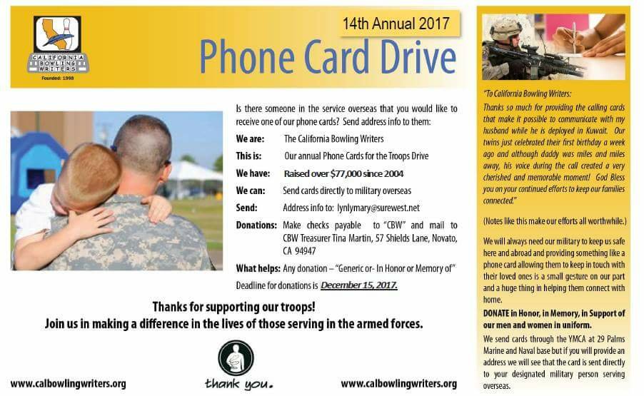 The California Bowling Writers are holding their 14th Annual Phone Card Drive now through December 15th. You can donate to purchase phone cards which are sent to our troops overseas so they can call home and talk to their families. To date they have collected over $77,000 which calculates to approximately 3,750 phone cards sent over the last 13 years.